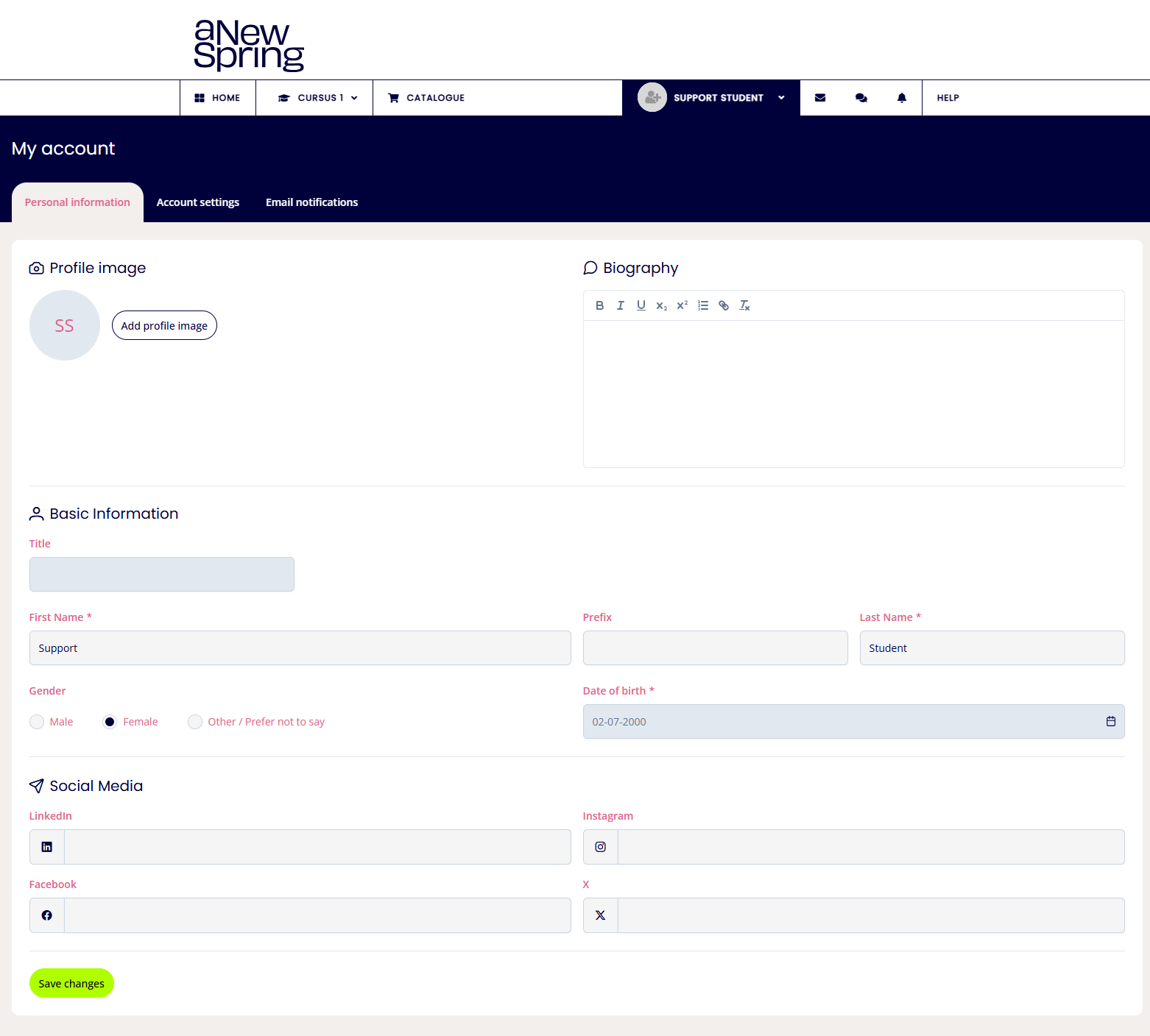 Change your personal data, upload a profile picture, add a biography and indicate which emails you would like to receive.