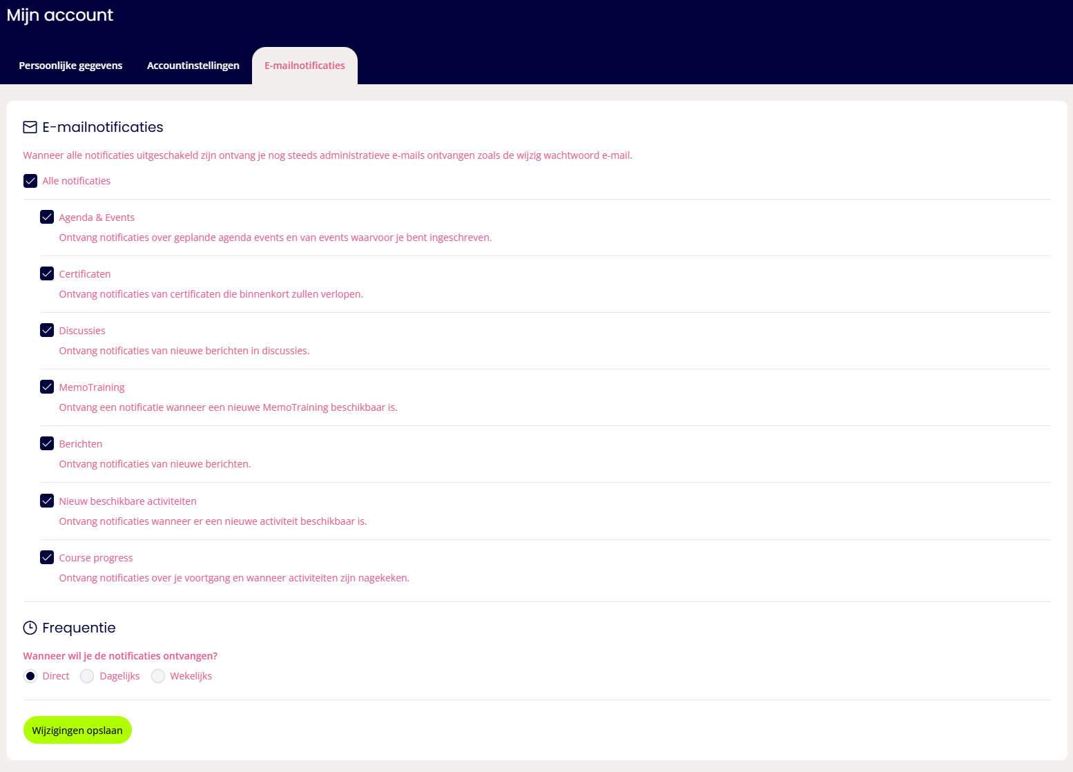 Via de tab E-mail notificaties kun je de e-mail meldingen uitzetten of aangeven om meerdere notificaties in één mail te ontvangen in X periode.